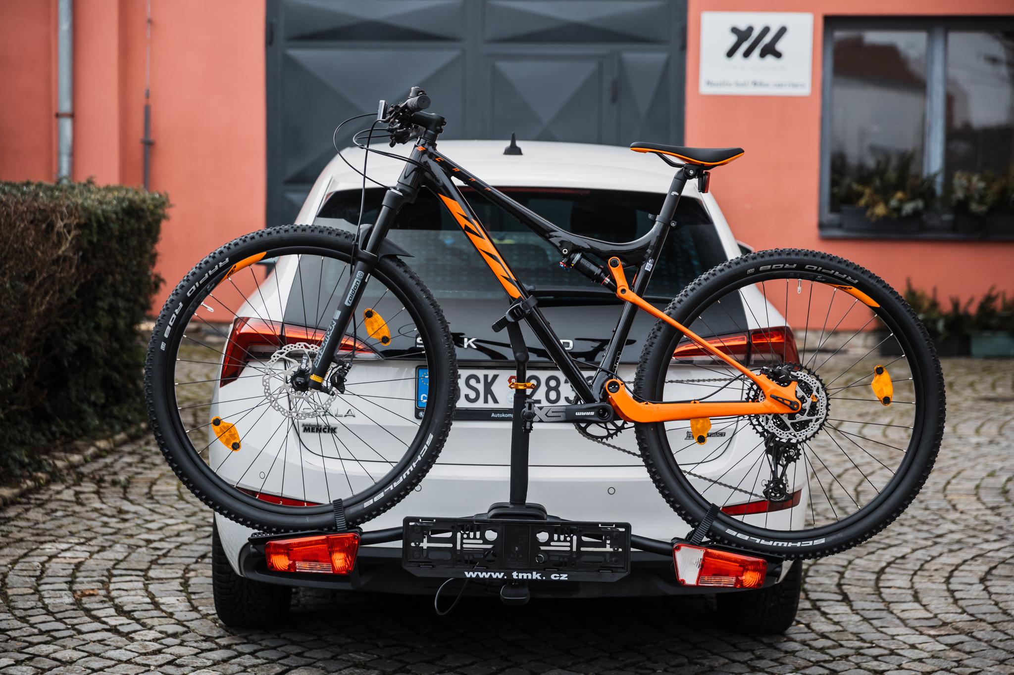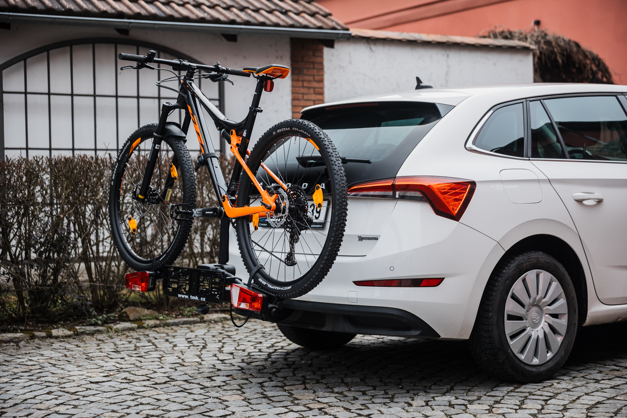Once the bike is properly fixed, attach the license plate, plug in the 13-pin connector, and you're ready to drive. A strong spring presses against the license plate holder, so you don’t need to worry about stability.